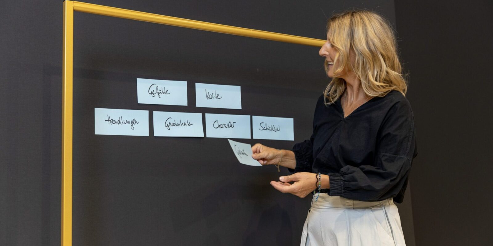 - Hand: Und dann wird gearbeitet. Fiktive Situationen aus dem Berufsleben, also echte Kundensituationen, Praxisaufgaben im Store. Hier wird’s lebendig – und immer sehr lustig. Aber vor allem: Hier entsteht die Veränderung, die bleibt.
